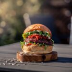 Bułka ziemniaczana, Wołowina 190g / Kurczak 220g / Beyond meat 130g bekon, cheddar, sałata, rukola, jalapeno, czerwona cebula, pomidor, sos majonezowy, ostry sos, ketchup