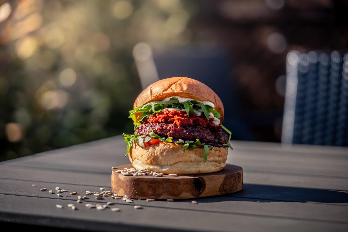 Bułka ziemniaczana / Bowl, Wołowina 190g / Kurczak 220g / Beyond meat 130g + 5 PLN, rukola, czerwona cebula, pasta z suszonych pomidorów, mozzarella, prażony słonecznik