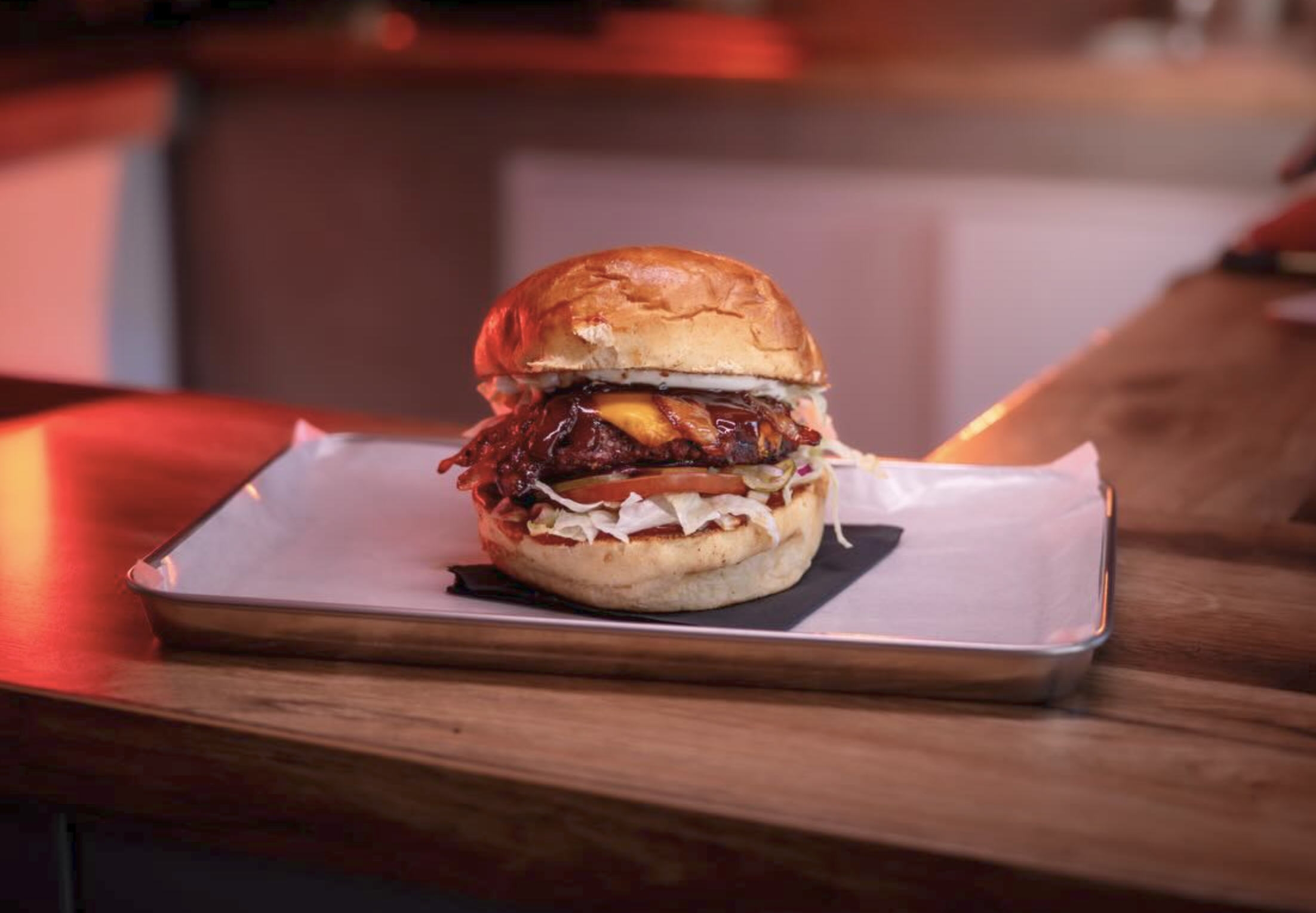 Bułka ziemniaczana, Wołowina 190g / Kurczak 220g / Beyond meat 130g, 2x mimolette, x2 bekon , sałata, pikle, czerwona cebula, pomidor, sos bbq burbon
